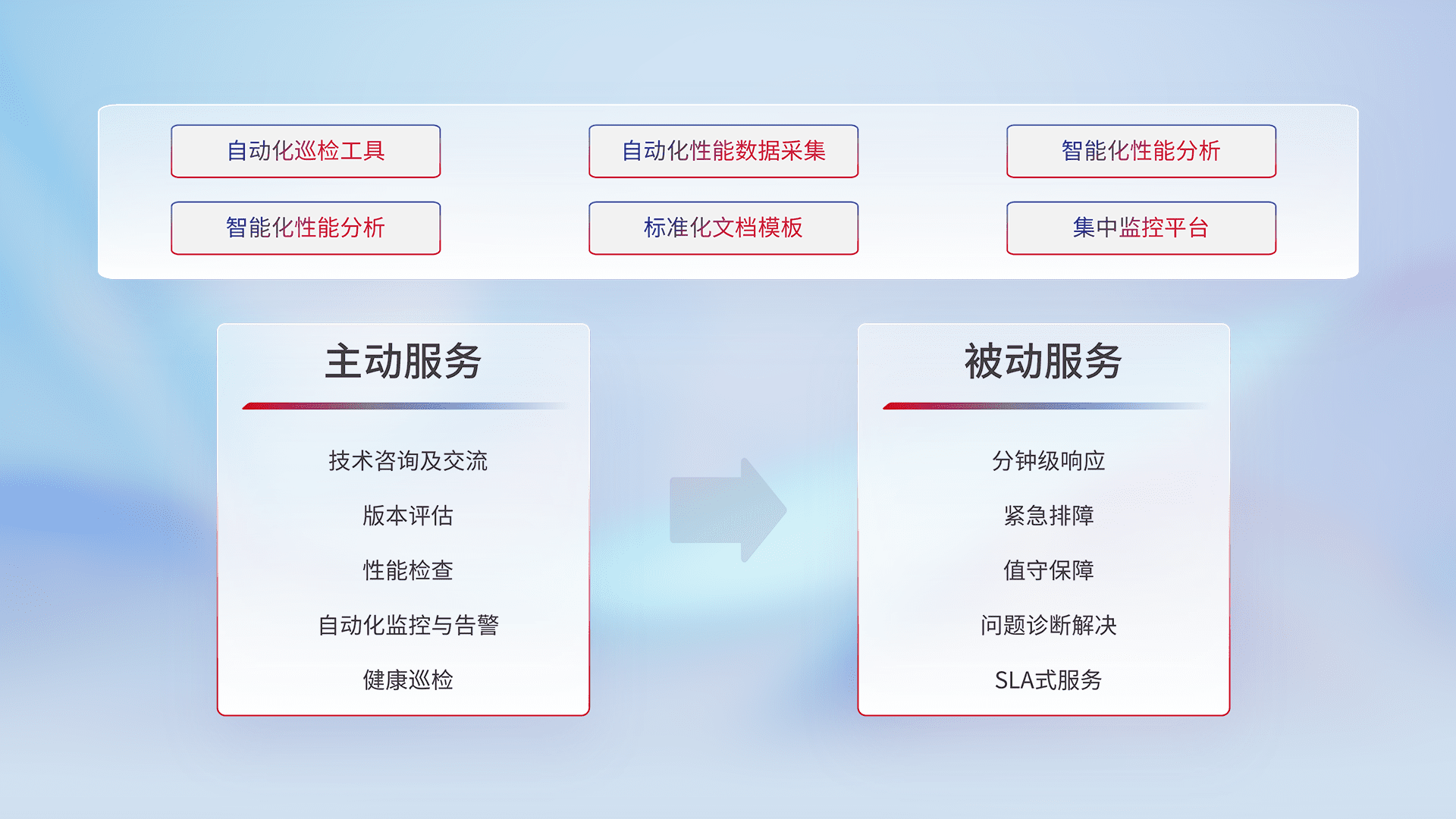 智能化工具和标准化文档,,,保障服务质量,,,,提供主动服务(包含技术咨询、、、版本评估、、、、性能检查、、自动化监控与告警、、、健康巡检)和被动服务包含(分钟级响应、、、紧急排障、、、值守保障、、、问题诊断解决、、、SLA服务)。。。。